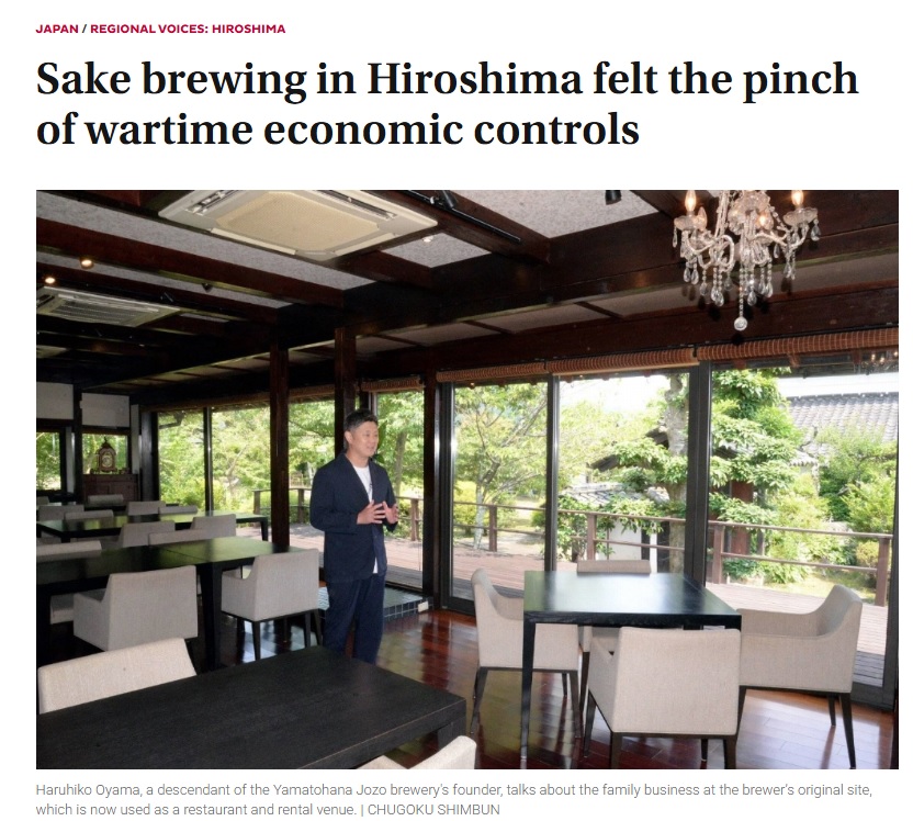 記事では、戦時中の経済統制によって大きな影響を受けた広島・西条の酒造りの歴史が紹介されるとともに、弊社の原点である「大和花醸造場」についても触れられています。