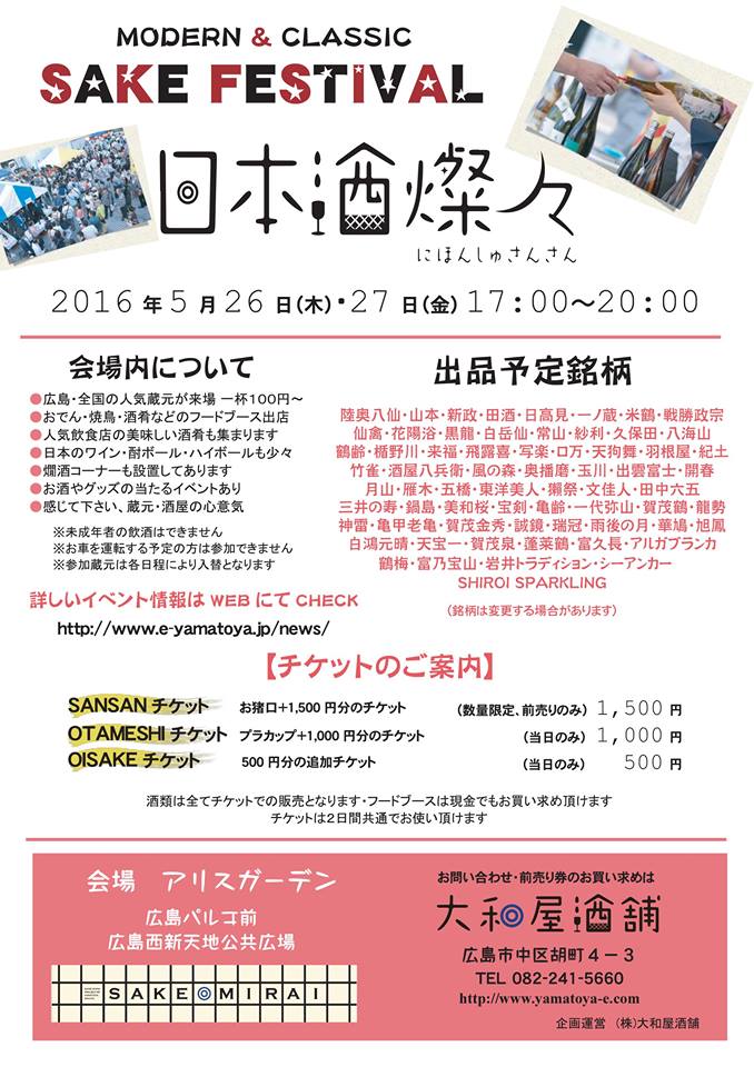 オオヤマの所感 2016.05.28この度は、手造りのNIPPONのSAKE普及イベント『日本酒燦々2016』にご参加頂き誠にありがとうございました。