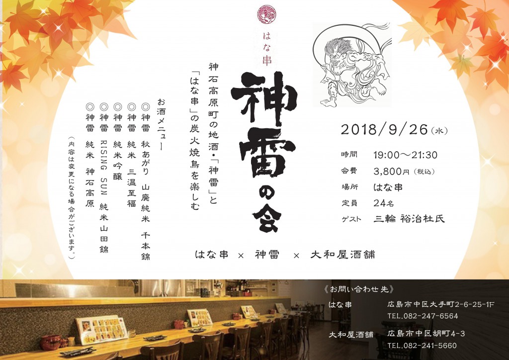 さて、9/26(水)「はな串 神雷の会」が開かれます。