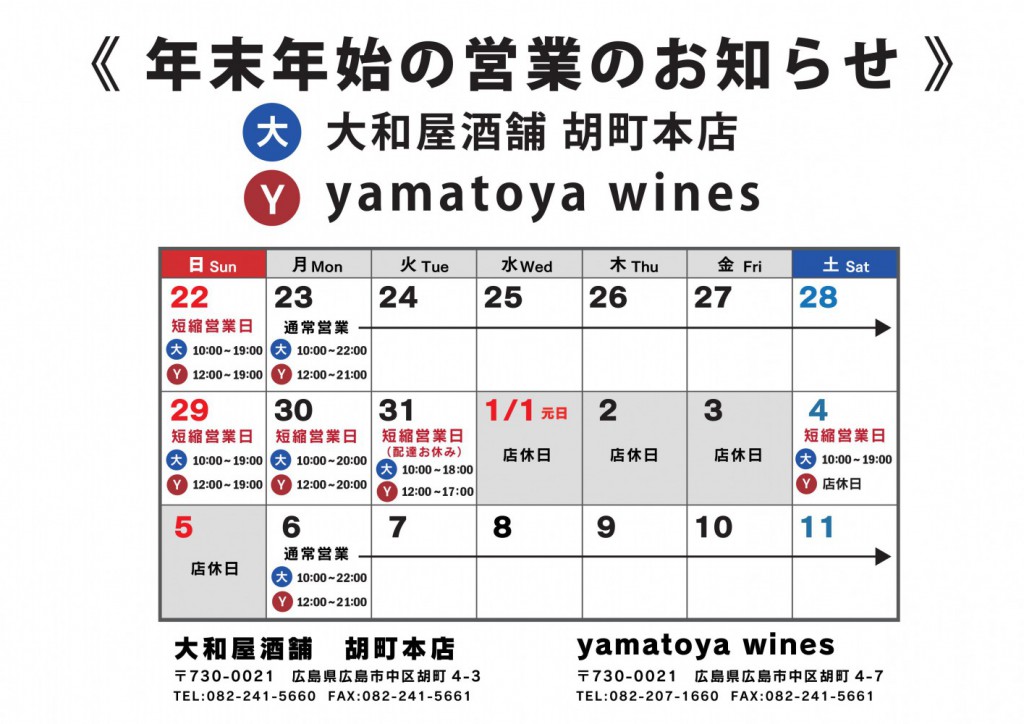 年末年始の営業時間・休業日のご案内