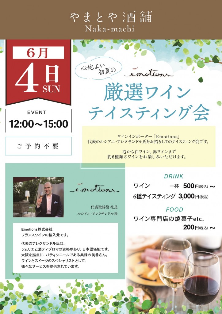 【6/4(日)12~15時】Emotionsワインテイスティング会開催♪